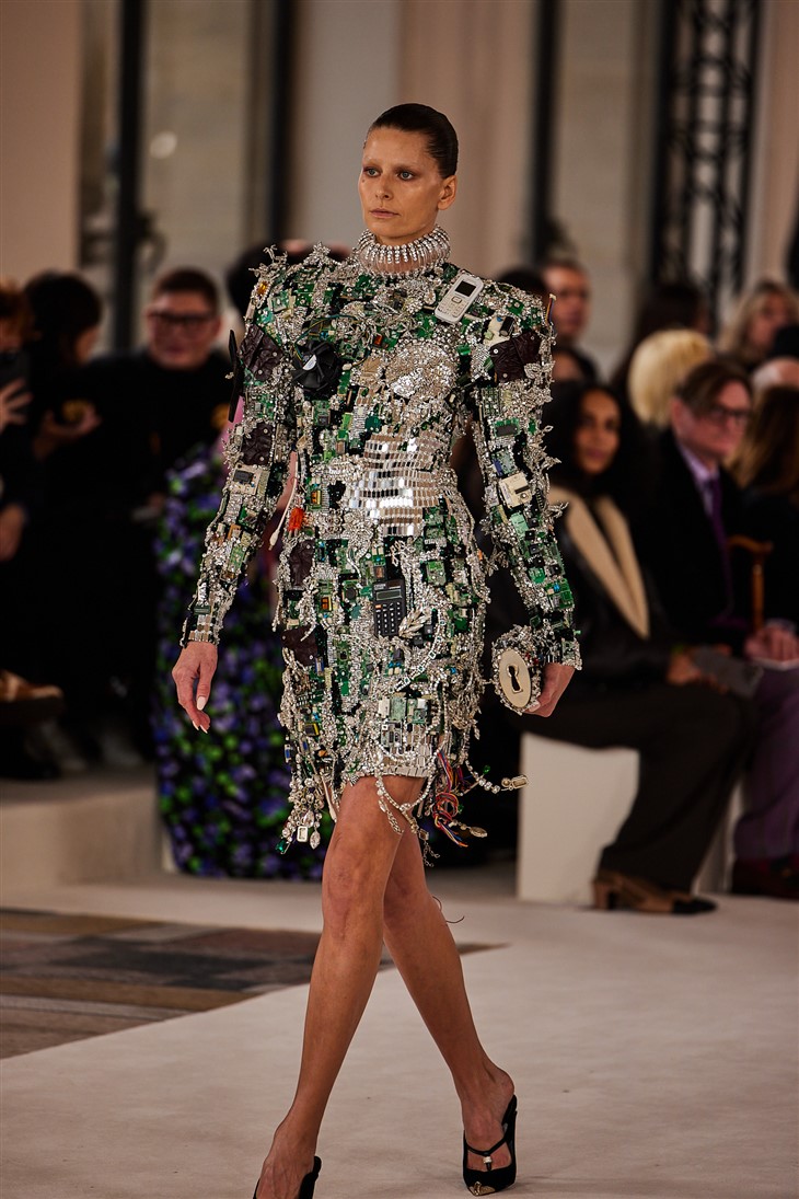 The collection embodies one of the Maison’s core philosophies, championed by Elsa Schiaparelli herself: the union of unlikely pairings in design. It honors this tradition by blending old-world techniques—such as intricate guipure laces, velvet and lace appliqués, and hand-embroidered chenille fringe—with modern shapes, patterns, and references. A standout example is a dress resembling a motherboard-and-strasse microchip, adorned with pre-2007 technological artifacts, a nod to the now-antiquated technology that was once cutting-edge.