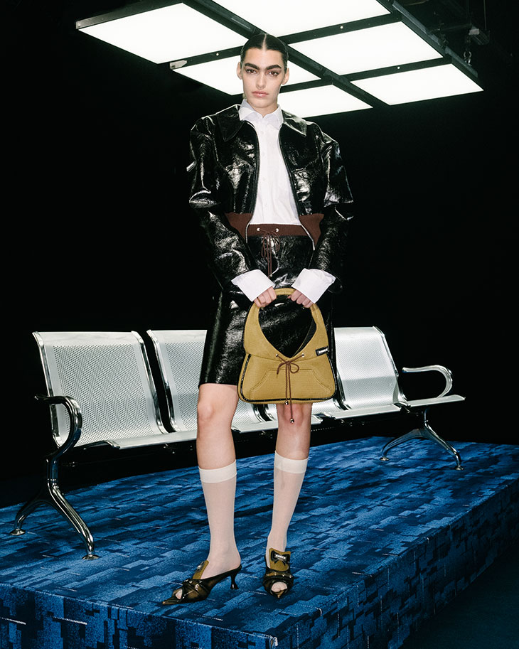 Beyond footwear, the Autumn Winter 2024 collection introduces the Hoodie Bag, an accessory that captures the season’s theme with its sturdy foam construction and tracksuit-inspired details. Also a part of the collection are deadstock materials transformed into a waist-cinching skirt suit and an elegant evening dress.