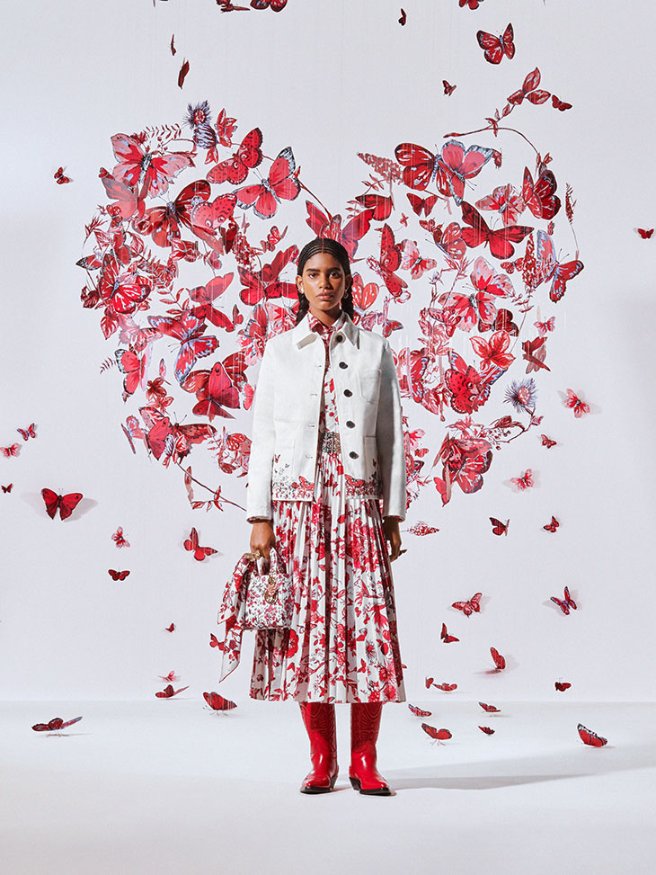 Celebrating the romantic sentiments, the House of Dior presents the ‘Le Cœur des Papillons’ capsule envisioned by Maria Grazia Chiuri. Drawing inspiration from the themes of the Dior cruise 2024 collection, these pieces are swamped with an array of intertwining flowers and butterflies, forming a precious heart motif. Conceived by artist Pietro Ruffo, this design saturates casual garments such as wrap-around knits, elegant t-shirts, and denim jackets with poetry. The collection extends to accessories, with bags ranging from the iconic Dior Book Tote to the Lady D-Lite, Lady Dior MyABC, and Lady D-Joy, as well as footwear including the Walk’N’Dior sneakers, D-Connect sneakers, and Dway mules, all enhanced by this motif. Adding another detail to each ensemble, refined silk scarves and D-Bobby bucket hats get this delicate drawing, which also appears necklaces, bracelets, rings, and the Dior Tribales earrings.