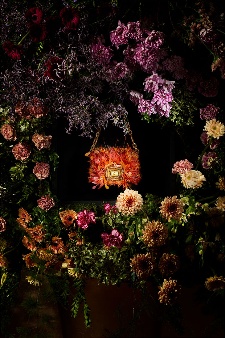 The collection’s showcase, set against the boutique’s iconic silvered walls, is a testament to Roger Vivier’s enduring commitment to beauty and artisanship. Epic bouquets of fresh flowers soar upwards, creating a joyful celebration that serves as the backdrop for the unveiling of the ‘Pièce Unique’ evening handbags. These exquisite pieces, shimmering amidst the vibrant flora, are crafted into fantastical botanical shapes, each one showing the maison’s innovative spirit.