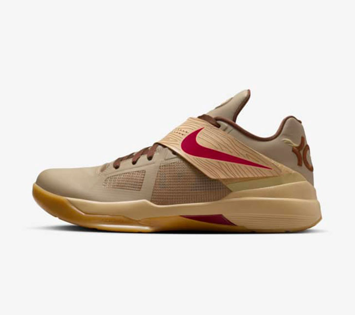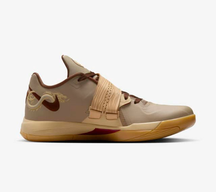 The Nike‘s KD4 “Year of the Dragon 2.0” celebrates the Year of the Dragon with a stunning comeback. Featuring a neutral base of Khaki and Sesame, this edition owns a wood-grain pattern on the forefoot strap, complemented by vibrant Noble Red accents that highlight the branding elements. A striking dragon motif, paying homage to the 2012 edition, elegantly wraps around the heel, incorporating Kevin Durant’s logo for a distinctive touch.