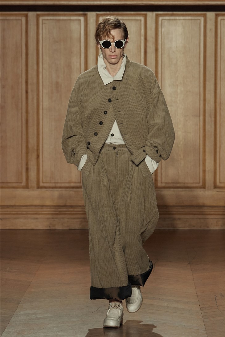 The color palette of “Decadentiment” reflects this fusion, with hues of moss green, intense lime, grey-blue, and red dominating the collection. Silhouettes reminiscent of pedestrians navigating city streets are expertly crafted, with coats billowing in the wind and a nostalgic atmosphere of the 80s, with influences from military uniforms and Southeast Asian accents. Rich fabrics such as wool, cotton, and linen form the foundation of the collection, complemented by substantial knit cotton, denim, corduroy, and velvet.