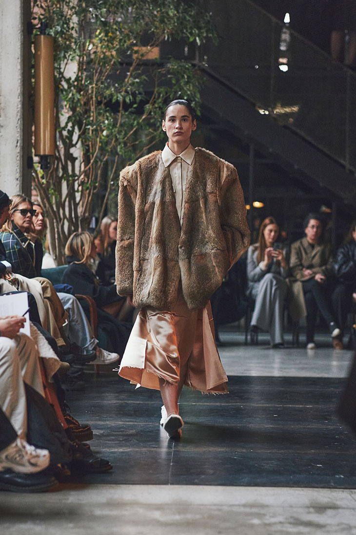 The emphasis is on volume, warmth, and unique lines, further developed by a carefully curated soundtrack by Thomas Costantin, along with hair styling by Henry Olivier and makeup by Giulio Panciera, using products from Weleda.