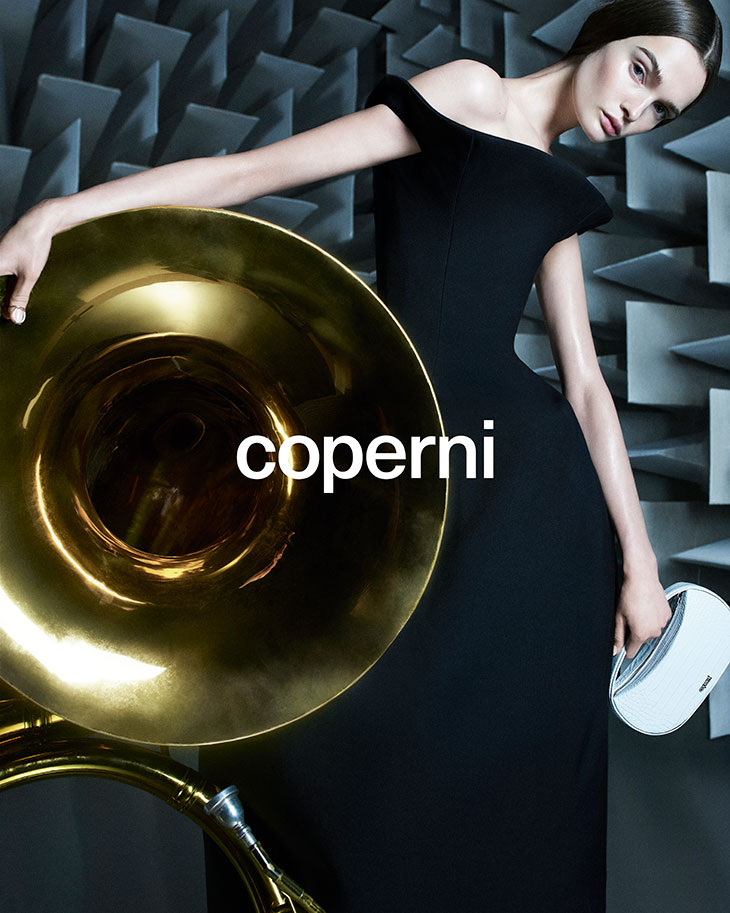 For Coperni‘s latest campaign, captured by the photographer Karim Sadli, an extraordinary setting was chosen: one of Europe’s largest anechoic chambers at LNE (Laboratoire national de métrologie et d’essais) in Trappes. This unique location, known for its capacity to absorb echoes and reverberations, perfectly complements the theme of the Spring Summer 2024 show held at IRCAM (Institute for Research and Coordination of Acoustics and Music), where music and science converged. The campaign, through its visual and auditory elements, once again homages the innovative spirit of Coperni.