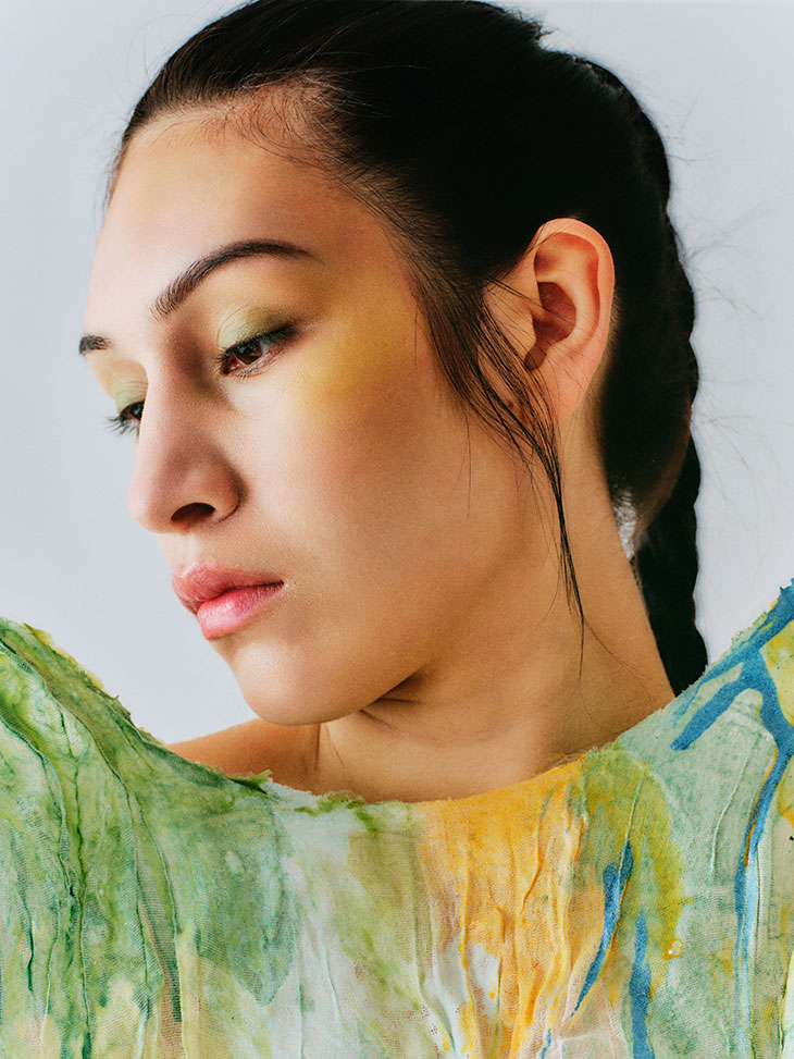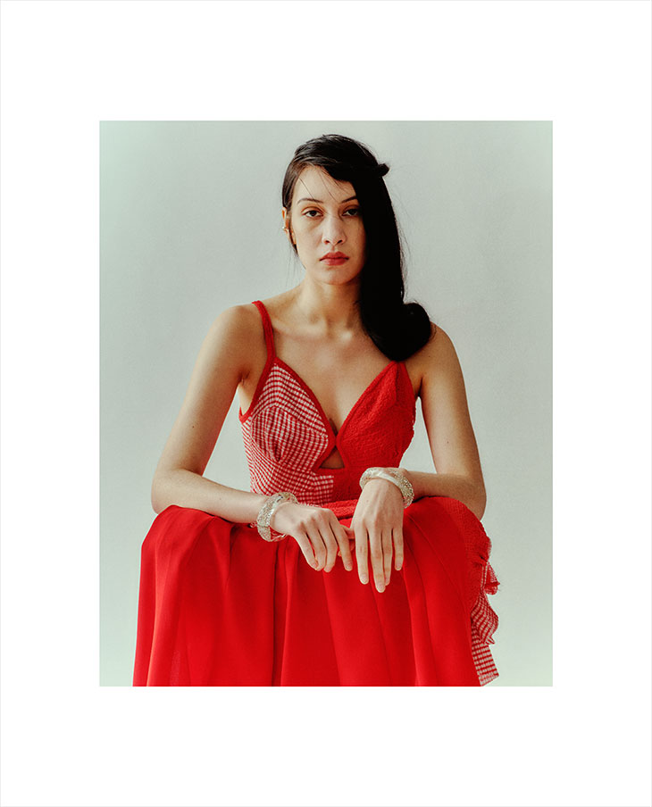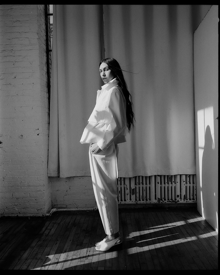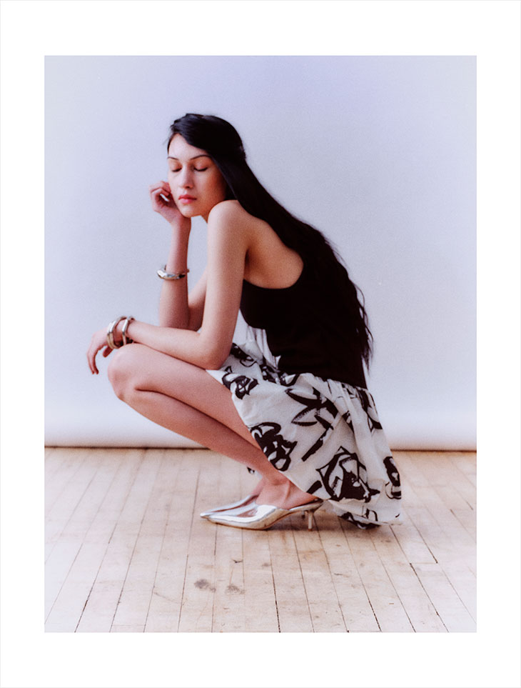 For the story Ruby, represented by New Icon New York, is wearing selected pieces from brands AKNVAS, AKNVAS x Stuart Weitzman, MSGM, Scarosso, Alexis Bittar, 3.1 Phillip Lim, ASHLYN, Kharys Studio, Greyhound Original, Falke, and Caroline Zimbalist.