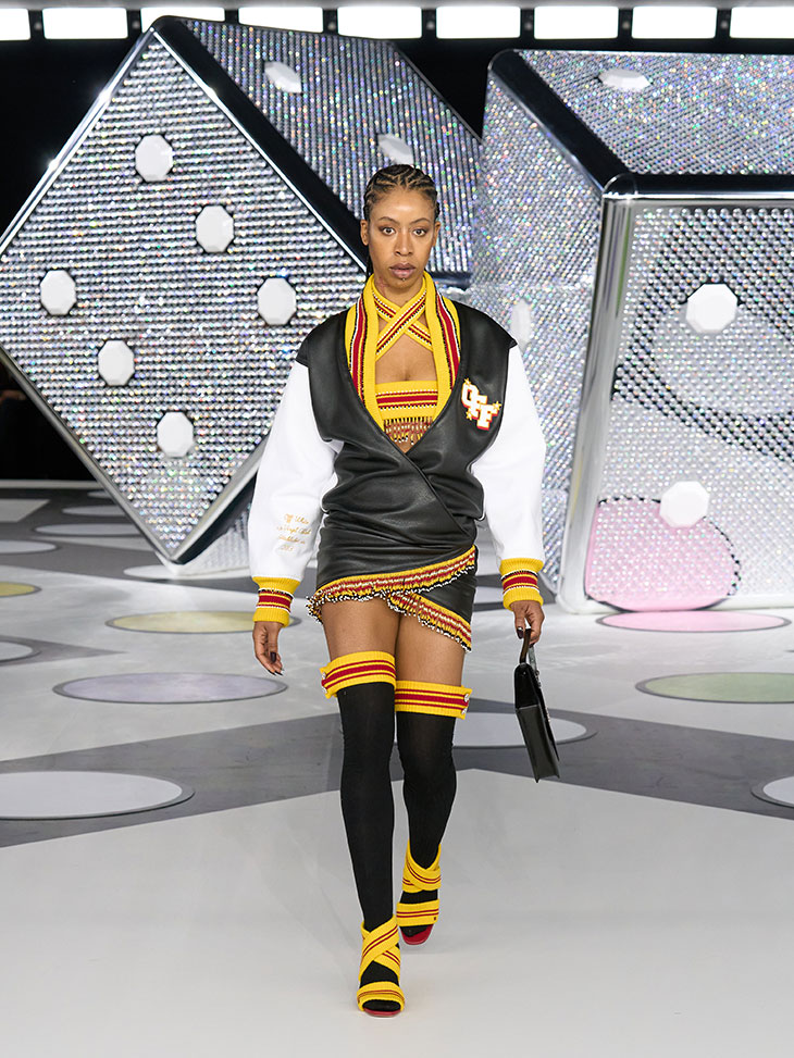 Designed in Milan and sparked by a revelation in Japan, “BLACK BY POPULAR DEMAND” emerges as a cultural statement, focusing on personal expression and the expansive influence of Black culture across the globe. The presentation is joyful and playful, with a fashion show set on a giant Ludo game board. Kamara’s approach to menswear and womenswear is unified by a shared vision yet articulated through diverse expressions.