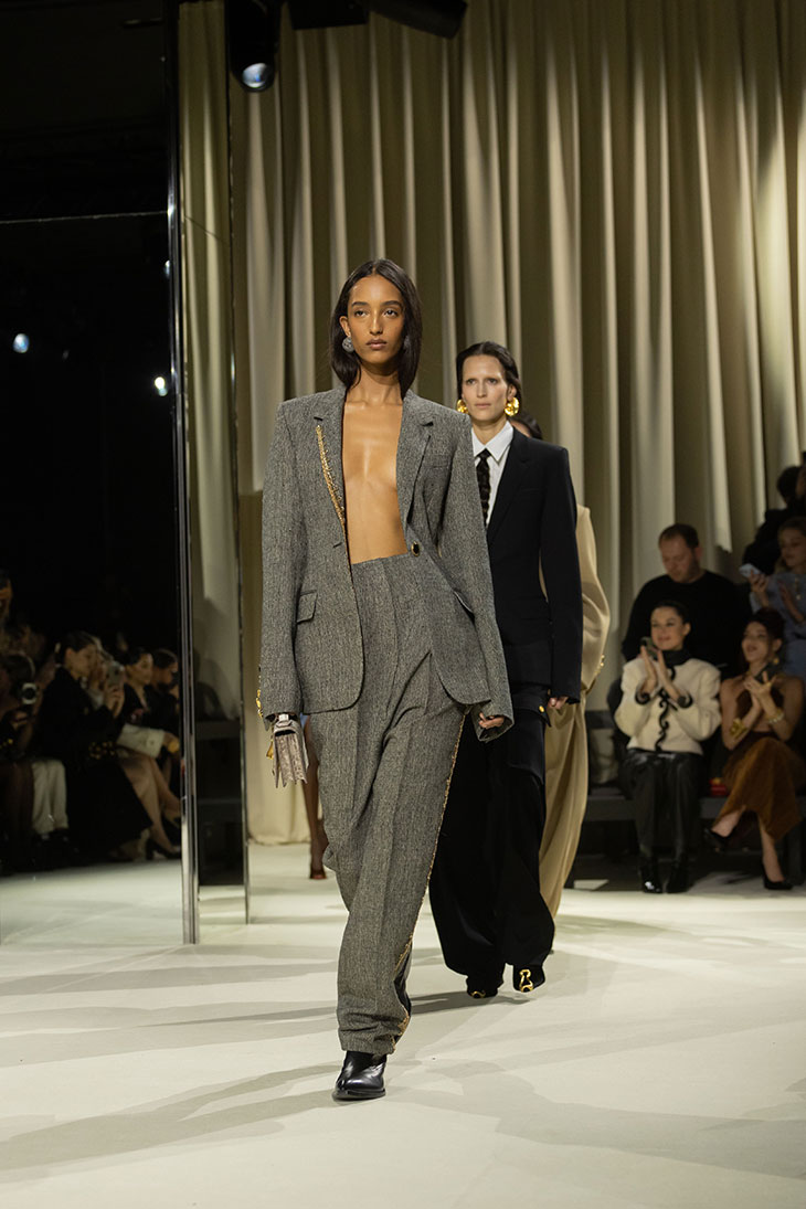 Ready-to-wear collection for Fall Winter 2024 is defined by its bold reinterpretation of classic elements through a Schiaparelli lens, blending founder Elsa Schiaparelli‘s iconic motifs with Roseberry’s own “Americanisms.” The result is a collection that has an array of blazer variations, crisp slacks, and dramatic evening wear, all with unique details like fringe, buckles, and denim. The essence of Schiaparelli, however, is most evident in the accessories — from the audacious Face bag to the iconic Schiap bag decorated with measuring tape and keyhole motifs. These pieces are focused on the future vintage concept Roseberry aspires to create.