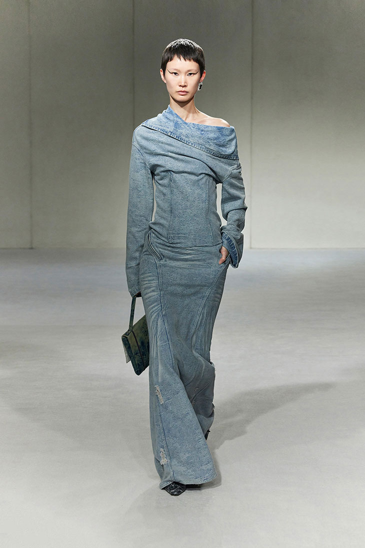 Central to the collection is the portrayal of today’s woman as a ‘multi-faceted beauty,’ whose dynamic lifestyle is mirrored in her versatile and defiant fashion choices. CT Liu’s designs encapsulate this modern woman, who transitions from the corporate world to the vibrancy of the nightlife, challenging conventional judgments with her style. Through the use of washed twill jeans, asymmetrically stitched garments, and textured knits, the collection introduces elements of subculture into mainstream fashion. This is taken further with a nod to the ’90s, drawing connections to the punk and grunge movements.