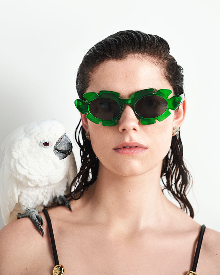 Footwear options range from espadrilles to biker boots, catering to diverse summer styles. Whether opting for casual sandals or statement-making sneakers, each piece is crafted with attention to detail, including distinctive features like crystal embellishments and metallic effects. The addition of the Sporty Mask eyewear, crafted in acetate with a wraparound design, further complements the summery aesthetic.