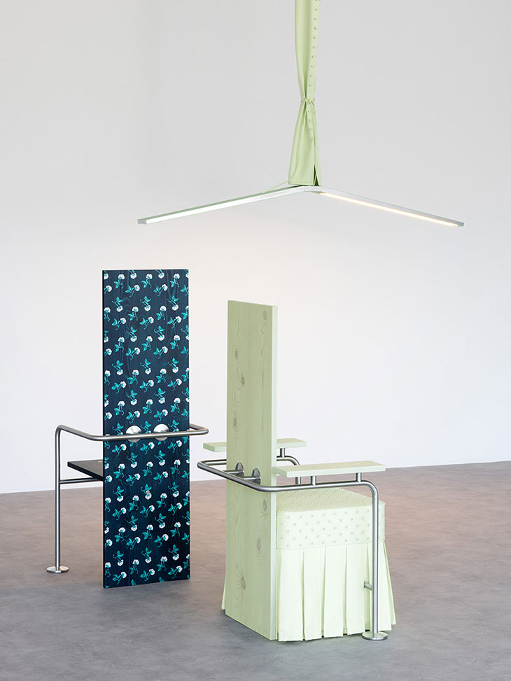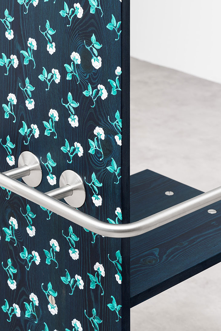 “La Casa Dentro” diverges from traditional Modernist approaches by reevaluating the material and conceptual foundations of the style. Formafantasma utilizes bent tubular metal—a fundamental element in Modernist furniture—to explore the tension between the practical realities of domestic life and the theoretical frameworks of Modernist architecture and design. The exhibition features pieces that blend rational, almost clinical structures of curved steel with elements that evoke personal memories, such as wooden planks decorated with hand embroideries, painted floral patterns, and silk volants.