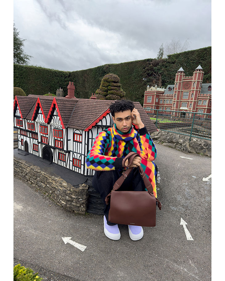 The campaign’s setting in Bekonscot Model Village adds an element of nostalgia and wonder. The detailed, downsized architecture is a whimsical backdrop for the Fall Winter 2024 precollection, creating a sense of familiar yet fantastical scenarios. Models are posed in playful yet thought-provoking ways: Sophie Wilde leans against a castle wall with a denim Squeeze bag, while Alison Oliver stands in a fortress with the Flamenco Purse. Enzo Vogrincic teeters over a railway tunnel in corduroy, holding a Flamenco Backpack, and Lesley Manville carries a giant sunflower alongside the Squeeze bag. 070 Shake, with a miniature deer on her head, gazes at the camera.