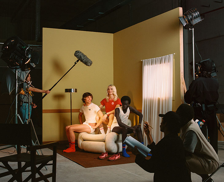 The collection draws inspiration from an iconic ’70s sporty figure, showcased through a behind-the-scenes peek at an advertisement shoot set in a studio reminiscent of Hollywood’s golden era. The scene is perfectly lit, highlighting models as they gracefully rehearse their movements against a backdrop of shadowy production figures, embodying a blend of retro allure and contemporary finesse.