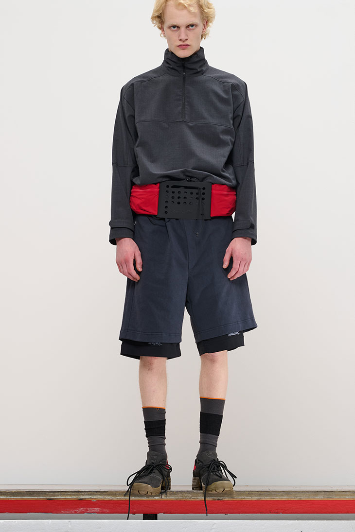 The collection is designed with inspiration from the backstage footage of field recording director James Benning’s movies, which statically depict factories, taxidermy, and anti-horizons. SS25 addresses the impact of advanced technology on natural landscapes, merging standard items with standalone pieces and collection sub-layers. This approach results in a material translation of the desire to capture the deadly shades of near-to-death flowers. Rural garments have been reimagined using innovative materials like paper-touch poplin, hyper-light membranes, textured technical jerseys, and peach-skin fleeces. Knitwear is presented in high-density cotton waffle knits and UHMWPE yarn, while mud-proof and waterproof duster coats reflect the clash between modern technology and 1950s shapes.
