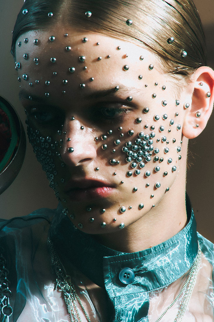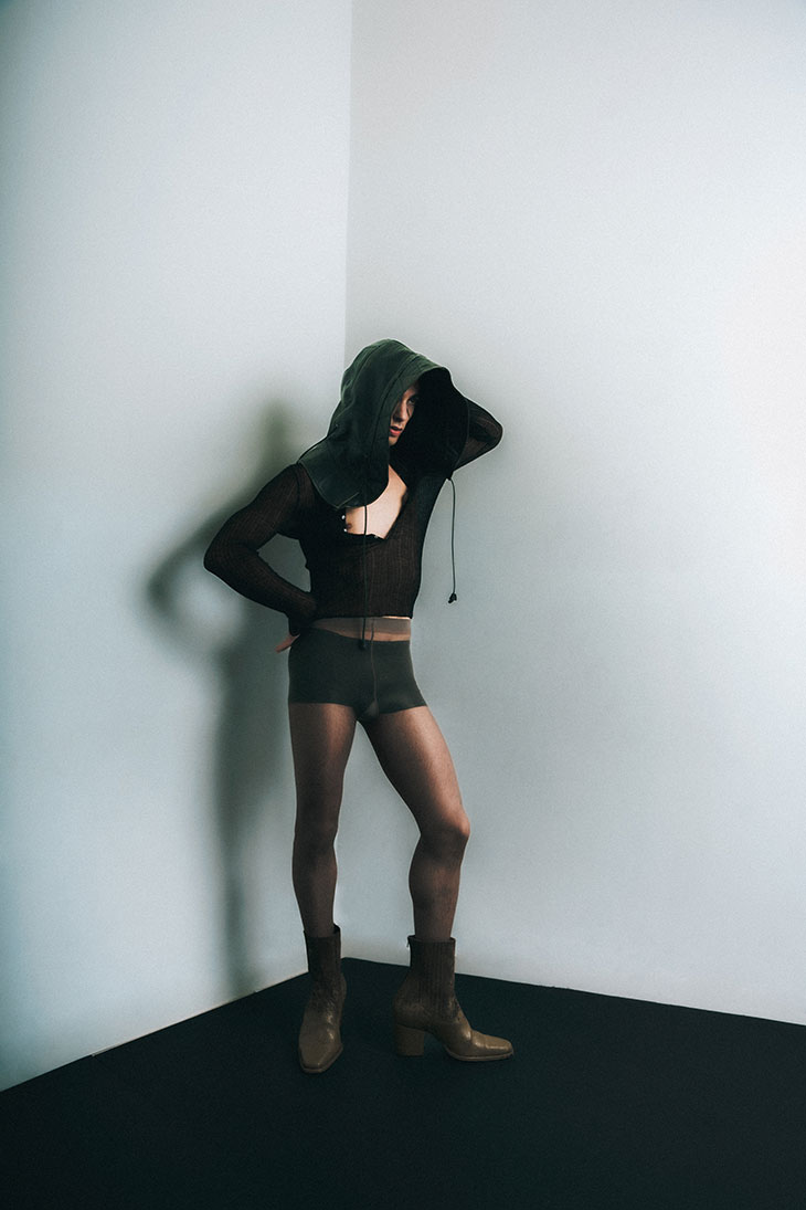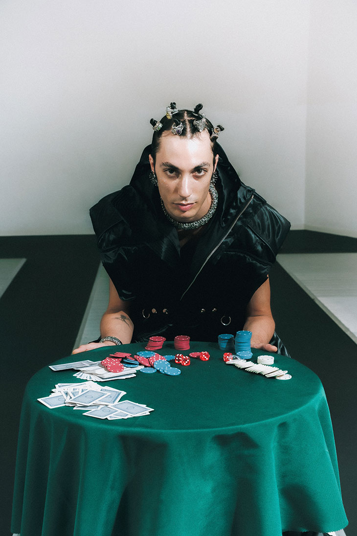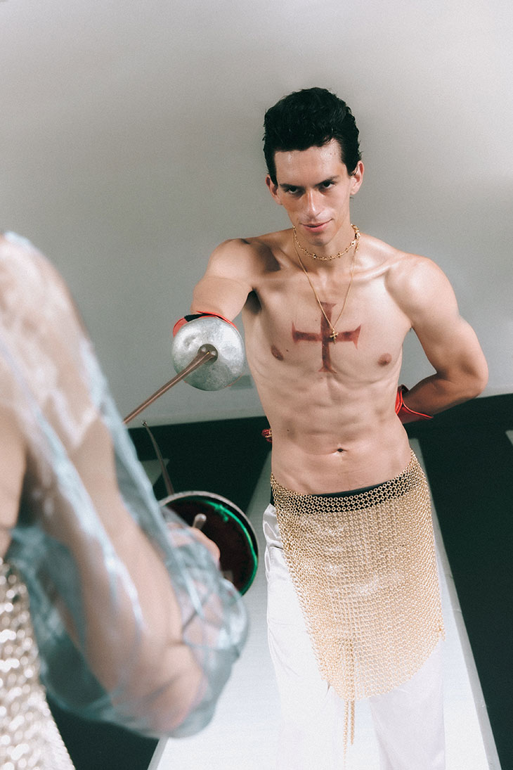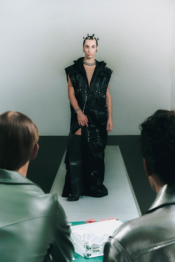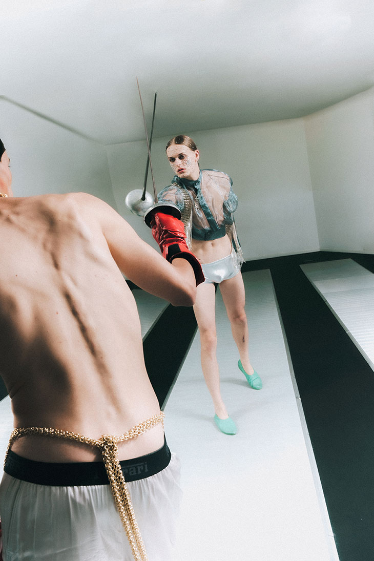 For this session, the models are wearing selected pieces from Adi, C.P. Company, Dhruv Kapoor, Domenico Orefice, Dsquared2, Emanuele Bicocchi, Ferrari, Florania, Maison Close, Maria E Luisa Jewels, Marsèll, Pasot, Réveri, Silviagnecchi, Vanesi Gioielli, Versace, Wolford, and Zyma Studio.