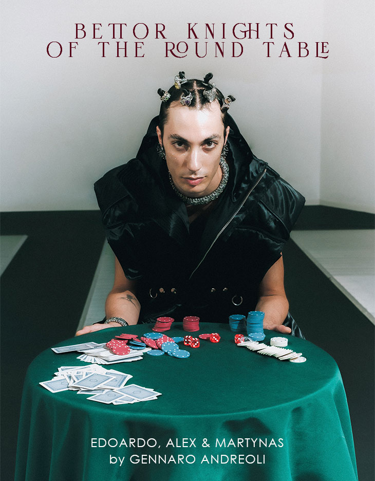Photographer Gennaro Andreoli captures the latest DSCENE STYLE STORIES exclusive feature, starring models Edoardo, Alex and Martynas. Styling and creative direction is done by Eugenio Monteleone, assisted by Chiara Naretto. Make up is done by Chiara Viola, assisted by Eleonora Marotti, while hair is by Marica Abbascía, with assistance from Genny Pagano.