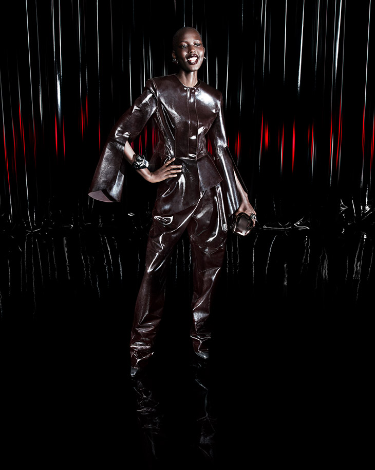 Central to the campaign is the interplay of light and shadow, with Vanderperre using these elements to emphasize the intricate textures and bold shapes that characterize the collection. The portraits are a study in contrasts, where darkness meets shimmering hues, and solid structures give way to fluid, liquid-like surfaces. This visual narrative is a deliberate reflection of Ferrari’s brand ethos – where speed, power, and precision converge to create something more than just fashion: a living, breathing embodiment of primal energy.