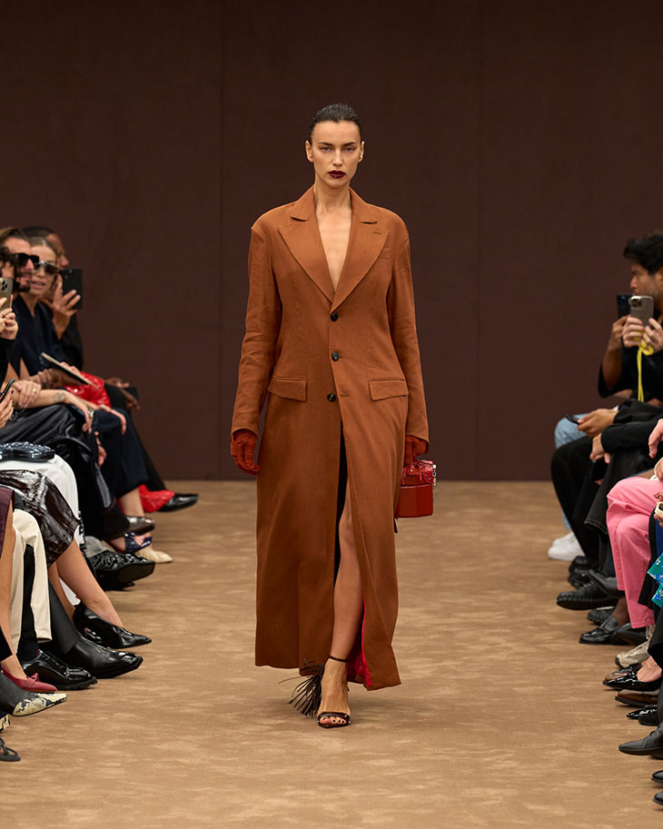 At the heart of the collection are the signature pieces of Ferrari’s wardrobe—tailored blazers, pencil skirts, bomber jackets, and trousers—each reinterpreted through Iannone’s precise attention to detail. The silhouettes are designed to sculpt and embrace the body, with flowing lines that emphasize freedom of movement without ever feeling restrictive. Through careful layering and deconstruction, each piece is imbued with lightness and fluidity, resulting in a collection that feels both powerful and sensual.