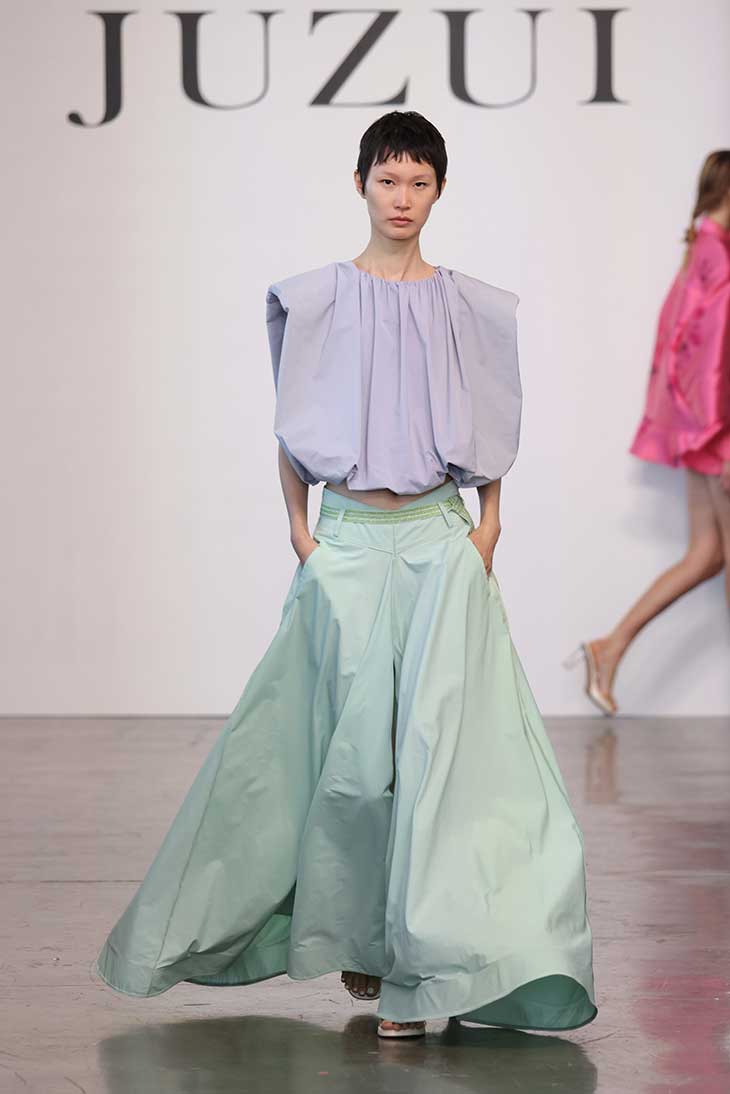 Color played a central role in this collection, with Wang employing a refined palette of classic hues. The soft shades were reminiscent of early morning petals, while more vibrant tones echoed the full bloom of a flower in its prime. This balanced color story reinforced JUZUI’s connection to the nature, but also spoke to the modern woman who is at the heart of the brand’s ethos. Wang’s ability to fuse traditional Chinese elements with contemporary fashion trends was clear in her choice of colors and fabrics, underscoring her commitment to “Neo-Chinese Fashion.”
