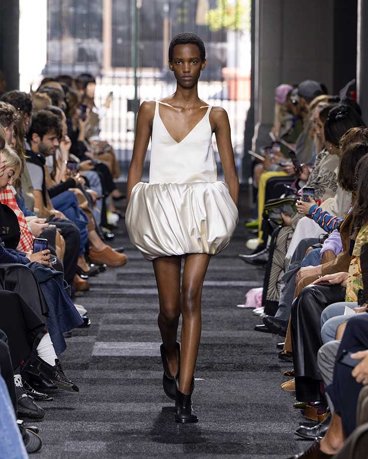 JW Anderson ’s SS25 collection takes a bold step by embracing strict boundaries in its design process, focusing on the materiality of clothing in a way that feels both innovative and purposeful. The collection is rooted in a reduced library of materials, pushing the creative possibilities of just a few key elements. One fabric—silk satin—anchors the garments, while cashmere is the sole yarn for knitwear, calf leather defines accessories, sequins are the only form of embroidery, and lace serves as the sole decorative detail. With these carefully selected materials, JW Anderson crafts a collection that emphasizes precision and intention, stripping away excess to reveal the essence of design.