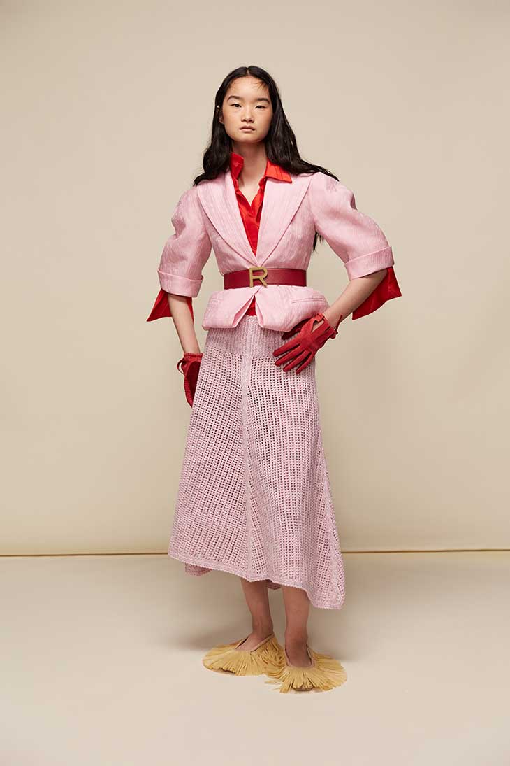 The nod to Marcel Rochas’ saharienne style is apparent in the collection’s jackets, which feature tonal brocades and patch pockets, offering a refined take on utilitarian elegance. The incorporation of tropical wool pencil skirts, monogrammed belts, and fil coupe striped satin speaks to the house’s enduring Haute Couture legacy, blending craftsmanship with modern sensibility. Flounced ra-ra skirts, kimono sleeve sundresses, and scarf necklines embody the fluid romance of the collection, with watercolour anemone prints and soft blocks of color bringing a delicate vibrancy to each piece.