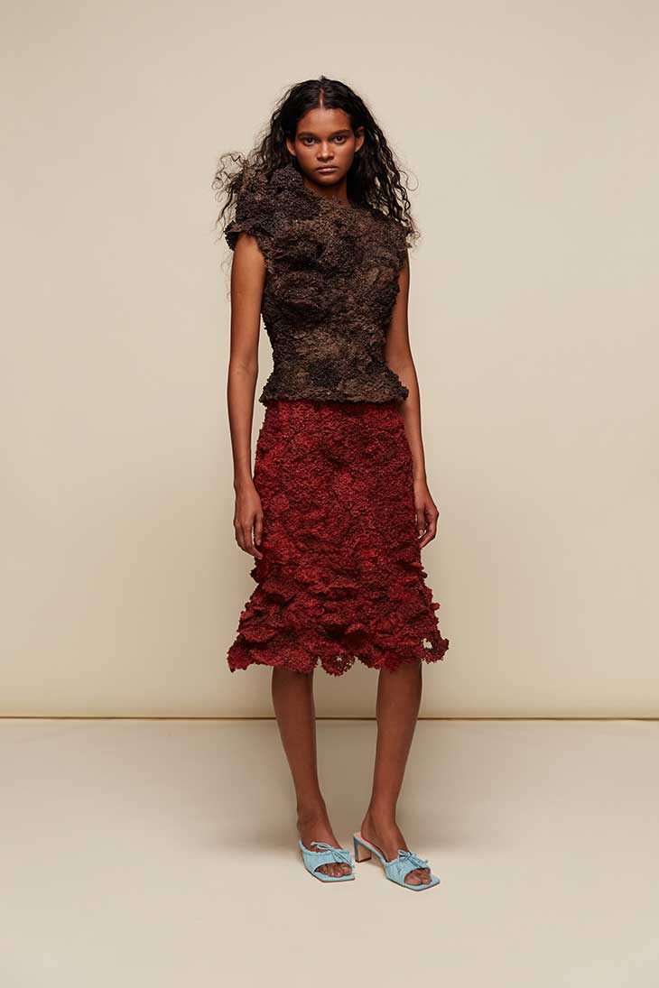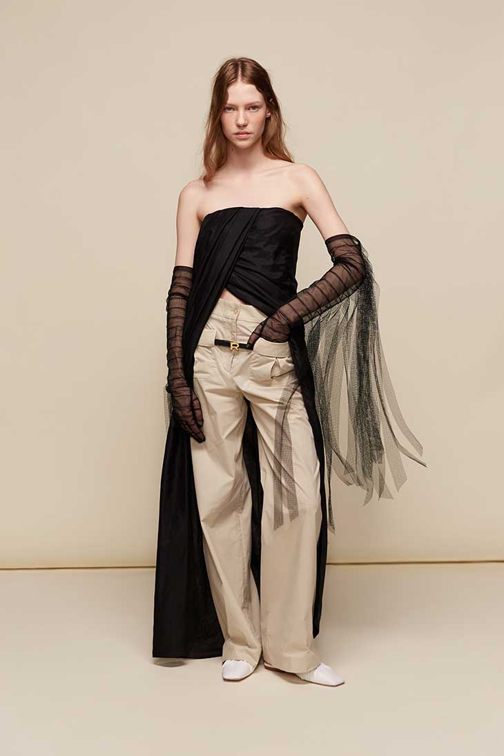 Athleticism, another nod to vintage beachwear, finds its place in the fine silk knitwear that underpins several looks. Bodysuits, baby tees, and wide pleated shorts exude a playful yet athletic spirit, transitioning between beachside relaxation and city sophistication. A draped skirt, wrapped like a beach towel, further underscores the casual elegance that Rochas envisioned for a life of leisure and style. Vigilante’s careful attention to layering and proportion enhances the collection’s ease, inviting movement and comfort without sacrificing refinement.
