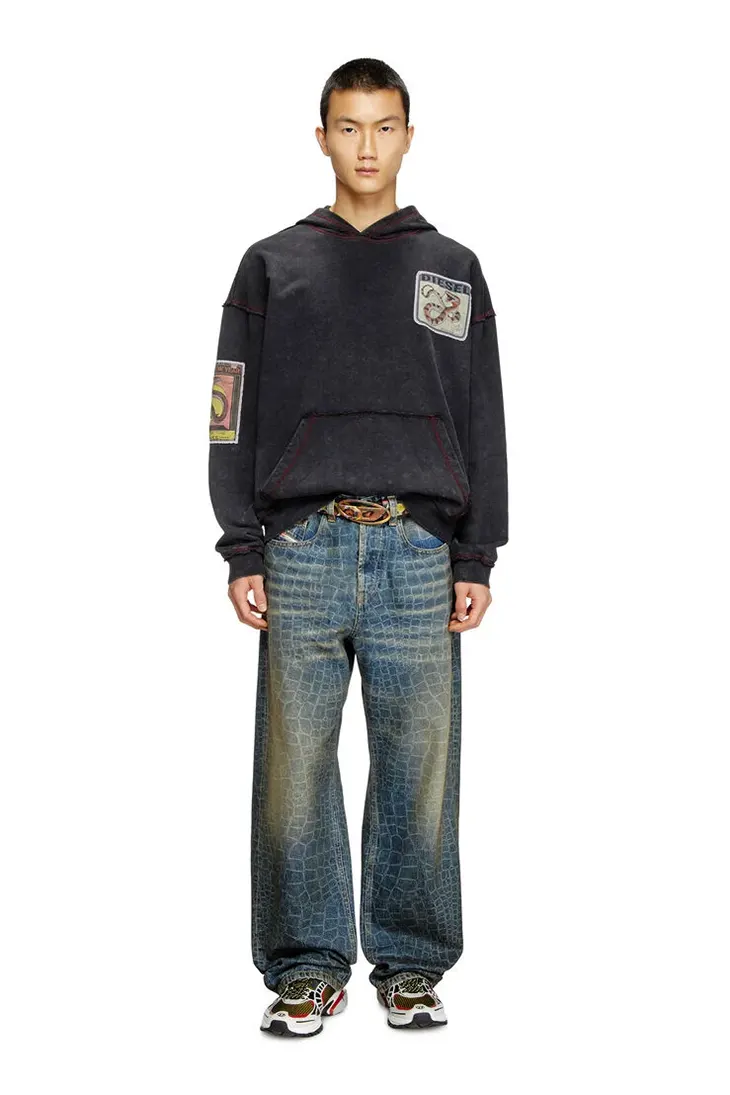 Key elements of the collection include scale-patterned denim, bold snake graphics, and intricate laser detailing. Standout pieces like the boxy black hoodie showcase raw-edge stitched patches with various serpent motifs, while the khaki long-sleeve tee brings a layered look with its peeling jersey overlay. Diesel’s hallmark denim makes a statement with dark blue trousers adorned with a custom snakeskin laser print, adding a unique texture to the collection.
