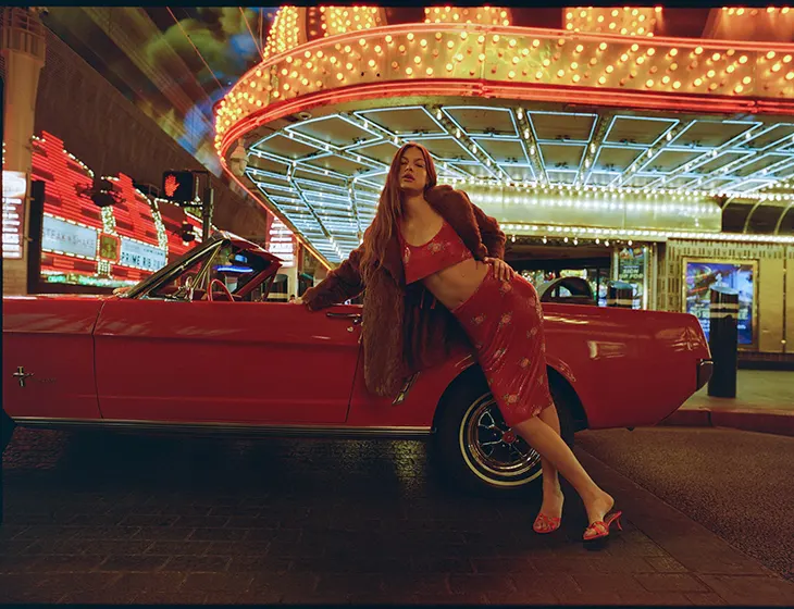 Each piece feels like a nostalgic love letter to vintage Vegas—evoking the allure of old motels, romantic diners, and starry-eyed nights along the Strip. Modeled by the radiant Lindsey Wixson and high-fashion muse Faretta Radic, the collection channels a modern showgirl aesthetic, transforming Valentine’s Day into a playful and glamorous escape.
