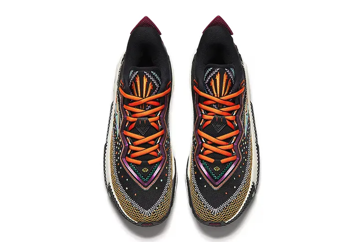 The upper of the ANTA KAI 2 Solar Return features a black woven base, layered with intricate embroidery and multicolor accents. These vivid touches stretch across the toe cap and side panels, depicting wave patterns and scattered particle-like dots. The embroidered detailing is more elaborate than earlier Kai 2 models, drawing on themes of solar energy, movement, and time. Orange and yellow lines resemble shifting frequencies, while clusters of dots symbolize the presence of light in its smallest form.