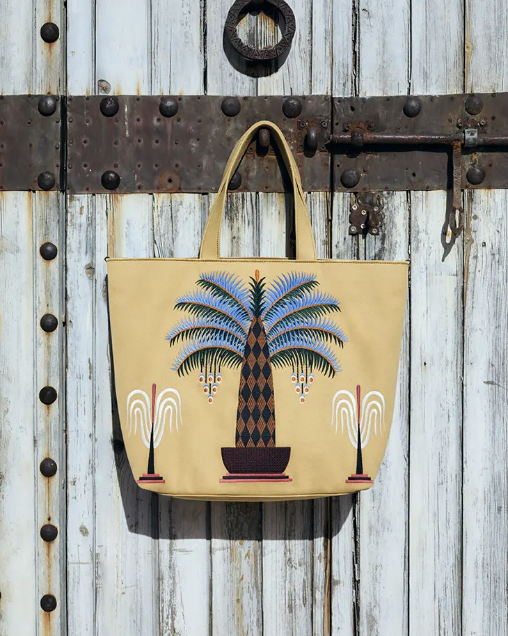 Your recurring use of botanical motifs feels especially resonant in this collection. What role do these organic forms play in your visual storytelling? – The botanical world is a constant source of inspiration—both for its pure aesthetic qualities and for the wealth of stories embedded in the landscapes around us. In this case, we started from Etro’s iconic paisley motif—an ancient decorative pattern, probably born as a wall or architectural ornament in Persia. It’s thought to represent a germinating date seed that grows into an intricate vegetal flourish. I imagined it as soil from which to grow a date palm—a recurring subject in my paintings—alongside aloe and cactus plants. All of these are deeply embedded in the landscapes of southern Italy, where both Marco and I are from, although they are native to other continents. These intersections fascinate and inspire me.