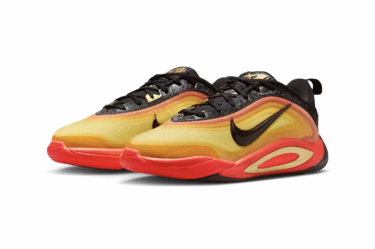 Visually, the sneaker leans into drama. A palette of Black, Bright Crimson, Metallic Gold, and University Gold forms the backbone of the silhouette, but it’s the gradient execution that sets it apart. The upper features a wave of yellow, orange, and red that fades like a desert sunset, giving the shoe movement and intensity. Glossy black overlays add contrast and structure, while metallic gold details elevate the finish, striking the right balance between heat and control.