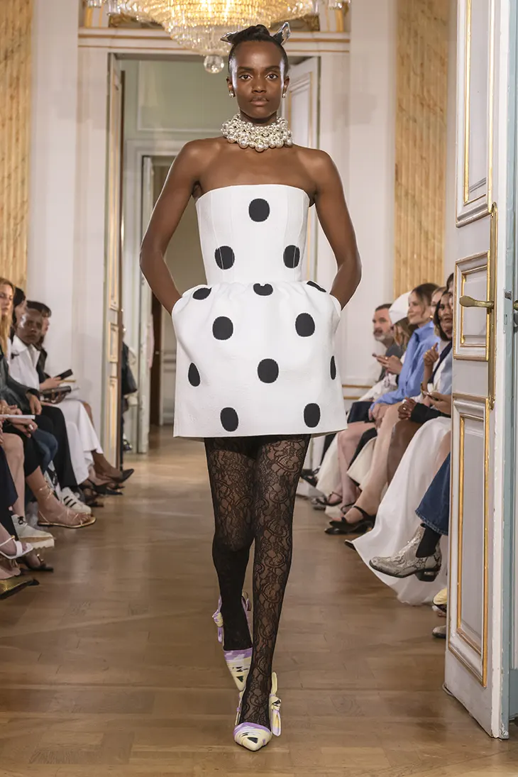 The mood was graphic yet fluid, with structured lines softened by sensual, summery fabrics. The color palette was fresh and optimistic: pale yellow, soft whites, mixed prints, and hints of playful pink. Daytime and nighttime elements were cleverly combined within single garments, balancing sophistication and Parisian charm. There were subtle nods to Jean Patou’s legacy, elevated with couture-inspired details that grounded the collection in the brand’s storied past.