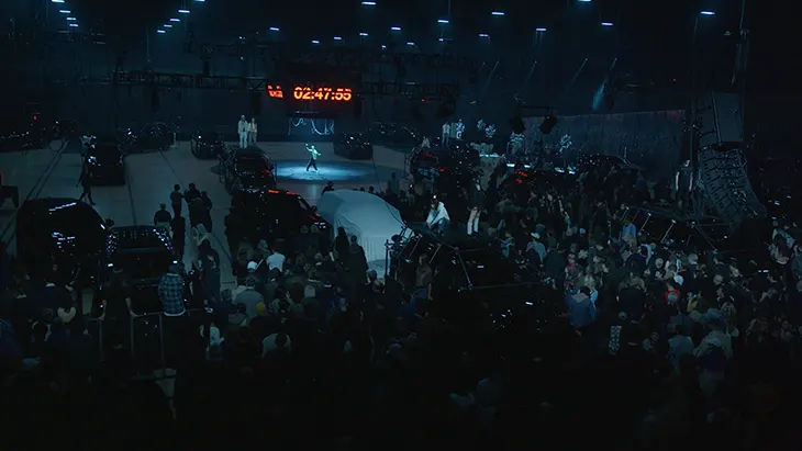 Imhof recasts the vast hall as a prom-styled gym. Streamers hang from rafters, balloons cluster near bleachers, Cadillac Escalades idle under the lights. Over three hours the cast moves through dance, music, and skateboarding while Imhof stages Romeo and Juliet in reverse. The work studies youth codes and shifting norms and builds a live collage where bodies, props, and sound set the tempo.