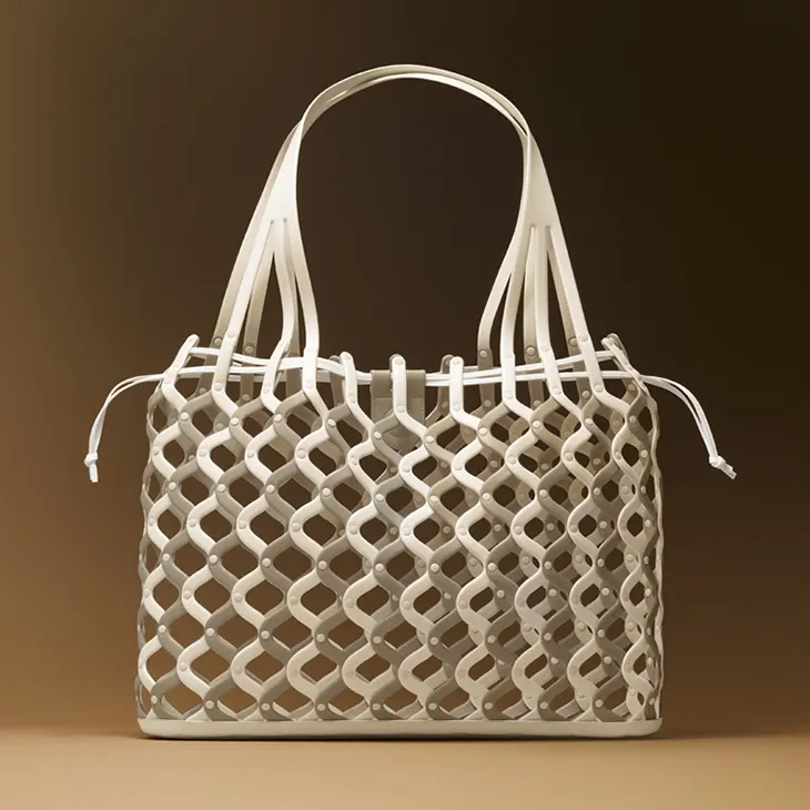 A net-structured bag series shaped as soft baskets, built with industrial precision and finished by hand.