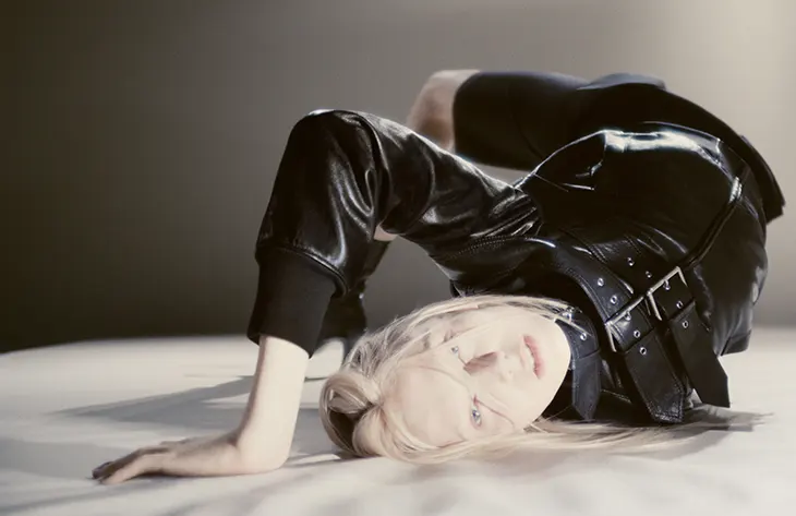 On the body, silk georgette ripples out of shadow into light; raw-edged lace reads precious and perilous at once; sharpened tailoring slices across the frame; black lacquered leather anchors everything with a gloss that feels ceremonial. Luchford’s camera lingers on movement, bodies arch, twist, writhe, then pulls back to show the group held together by a wordless force. The choreography’s arc (by Benoit Swan Pouffer) mirrors the narrative: restraint tipping into rapturous release.