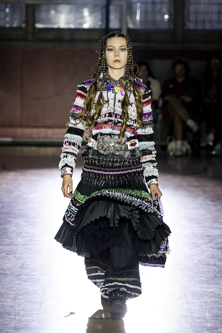 Bulgarian folklore remained a key presence, grounding the spectacle in heritage. Belt buckles and tiered dresses, inspired by traditional Karakachani pieces, were reworked into zip-off styles that morphed from maxi to mini, offering modularity in step with contemporary life. Chainmail, referencing folkloric jewelry, wrapped models in both protection and history, situating girlhood within a lineage of toughness and resilience.