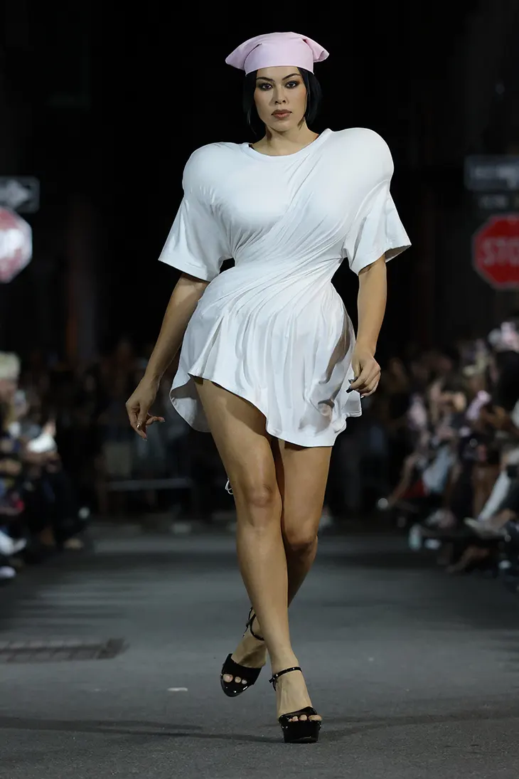 Footwear, courtesy of DSW, brought unexpected textures and silhouettes, perfectly complementing Cowan’s balance of strength and softness. Dainty buckled hardware fastens cotton poplin tops and marabou-embroidered boleros, while latex dresses, developed with Vex and inspired by Rimmel London’s Lip Latex collection, introduce 100% rubber latex minis and column gowns. Each piece is meticulously cut and rejoined, creating seamless, second-skin silhouettes complete with matching gloves, offering a modern take on resilience through precision. Accessories play a significant role in reinforcing the collection’s narrative. The beach-to-bar raffia tote, created in partnership with Sol de Janeiro, is accented with the brand’s sun-soaked palette and finished with a detachable faux croc perfume mist holder, a playful nod to Sol’s fragrance mists. As the exclusive Body & Fragrance Partner, Sol de Janeiro infused the show with its radiant energy, ensuring models glowed with Brazilian Bum Bum Cream and the signature Cheirosa fragrance wardrobe.