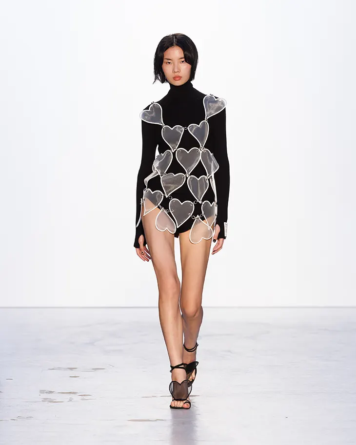 The collection carried forward elements from the Obsession series, pearl details, bow accents, denim reformation, and heart motifs, which resurfaced in silhouettes that felt both clean and fluid. Metallic shimmer and fluid tailoring echoed the vibrancy of disco while grounding it in contemporary clarity. Kimintē Kimhēkim looked to the parallel dynamism of K-pop, connecting it to the free spirit of the 1970s, with the message “Be you, let love shine” running through the show as its guiding statement.