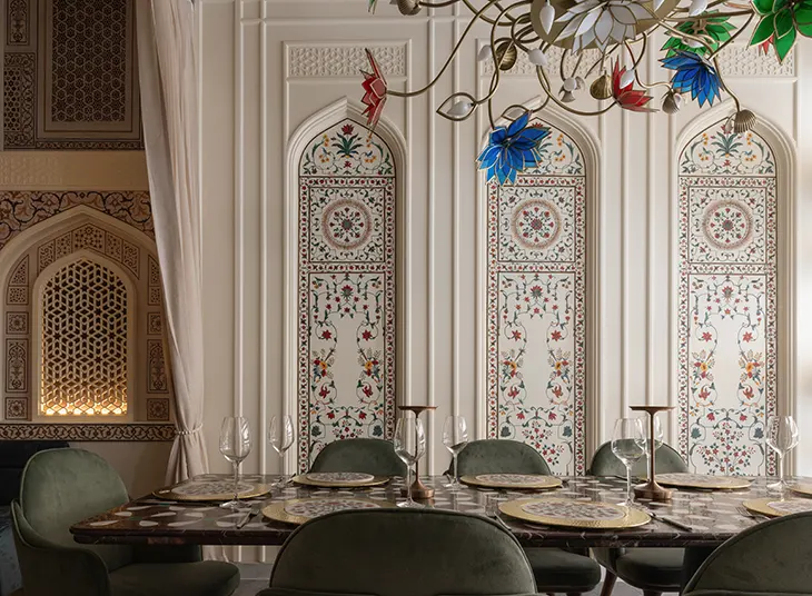 The setting is no less ambitious. Designed with Delhi-based Chromed Studio, Musaafer envelops guests in a world of Indian artistry and opulence. Marble walls, patterned glass, antique décor, and mother-of-pearl details frame the space, while highlights like Sheesh Mahal, a breathtaking all-mirror dining room inspired by traditional palaces, create a sense of wonder rarely found in the New York dining scene. The cocktail program is equally inventive, with drinks like The Truffle Master and Bombay Velvet turning mixology into performance.