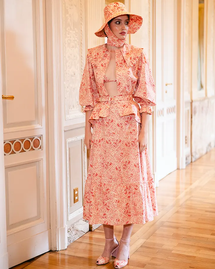 Accessories supported the narrative with practicality. Belts took sculptural forms shaped like petals, foldable hats were designed for sunlight, and shoes crafted in collaboration with Italian artisans grounded the looks. Each accessory reinforced the idea of beauty with purpose.