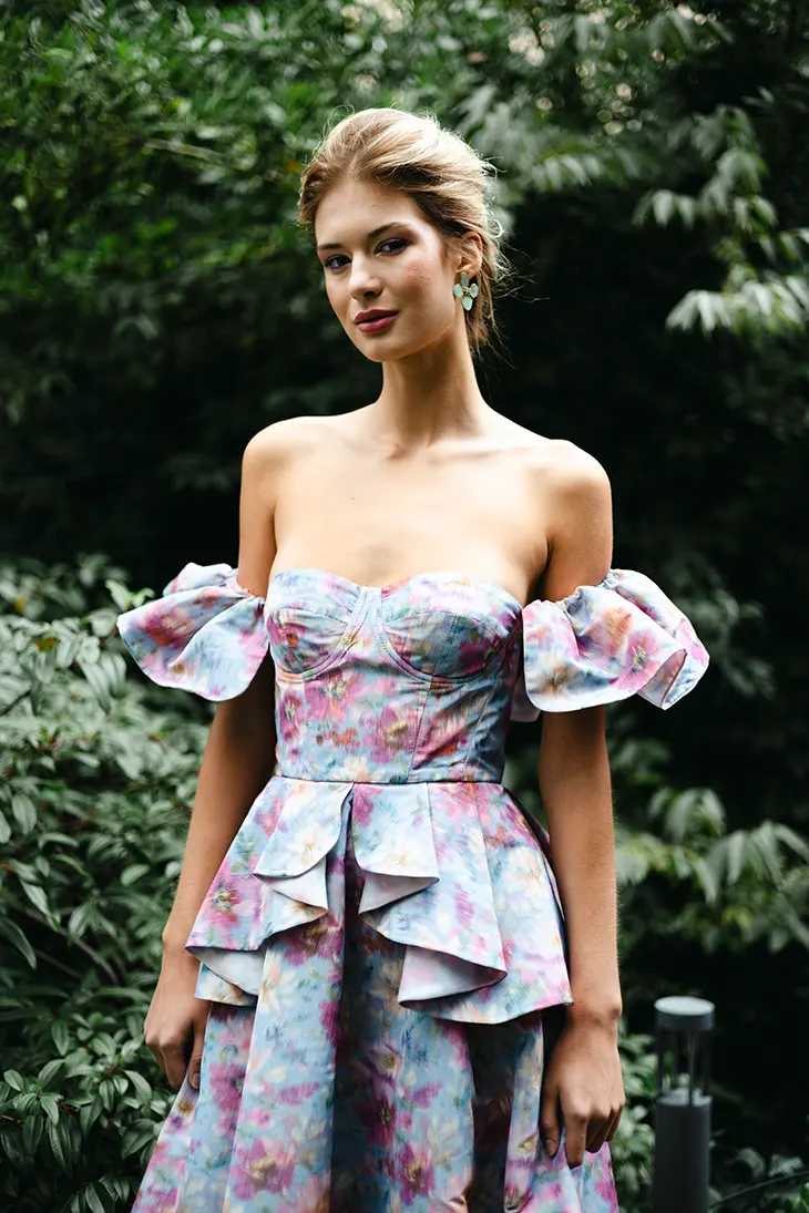 The wardrobe extended across occasions. Corsets paired with trousers and cropped jackets worn with skirts introduced tailoring into the collection, while shirtdresses and Capri pants delivered ease. Evening gowns carried embroidery, tulle, and sequins that shimmered as models walked through the courtyard, creating a sense of romance.