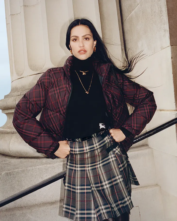 Outerwear remains the foundation of Burberry’s offering. This season, proportions and materials push forward with new energy. The Castleford trench returns in water-resistant cotton gabardine from Yorkshire, joined by the Fitzrovia coat, which introduces an A-line silhouette. The Chestwood trench for men takes its shape from an archive piece from the 1980s, designed with a relaxed fit. The Berryhill car coat uses a dramatic fit-and-flare, while the Floriston jacket updates the quilted silhouette with a boxy cut in shiny nylon trimmed with corduroy.