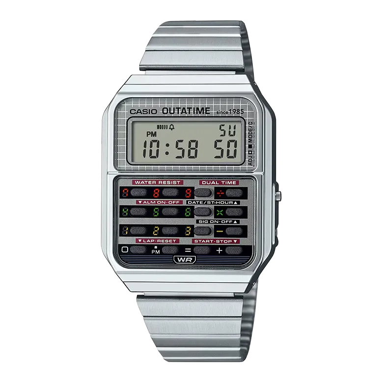 The silver-tone case recalls the stainless steel finish of Doc Brown’s DeLorean, the film’s legendary time machine. Subtle color accents on the calculator buttons echo the glowing hues of the car’s time circuits, giving the face a sense of cinematic nostalgia. Every tap on the keypad revives the tactile charm of the original digital era while connecting the wearer to the film’s theme of time travel and invention.
