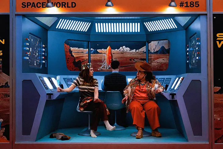 Production designer Zazu Myers and cinematographer Ruairí O’Brien create the vivid architecture of the Junction, a circular, Brutalist structure layered with artificial skies and endless advertisements. Costume designer Angus Strathie, designs wardrobes that trace decades of memory. Olsen cycles through more than twenty looks, reflecting different eras of her life, while Teller and Turner embody contrasting archetypes of middle-aged reality and romantic idealism.