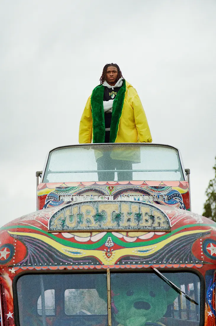 The broader offering features varsity and bomber jackets, sweatpants, hoodies, T-shirts, and headwear. The designs reinterpret collegiate style with a psychedelic edge, linking the university’s legacy with the band’s impact on music and visual art.