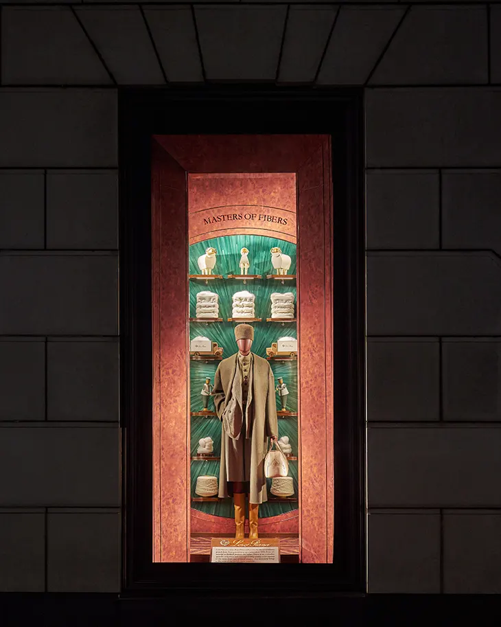 The women’s displays trace the transformation of raw materials into exquisite fabrics. “Masters of Fibers” illustrates cashmere’s journey from bales to weaving in miniature Loro Piana trucks bound for Italy. Another window depicts baby cashmere goats suspended in a cloudy sky, a poetic nod to the fiber’s delicacy. The following scene celebrates the thistle flower, a historic tool for brushing fine fabrics in the Maison’s Quarona factory, while another portrays New York’s skyline alongside artisans inspecting cascading fabric under magnifiers and needles. Sketches by Italian artist Marcello Dudovich then evoke the elegance of the Art Deco period, leading to the final vignette: a green window displaying a special scarf created for Bergdorf Goodman, surrounded by globes tracing the origins of the world’s finest fibers converging in New York.