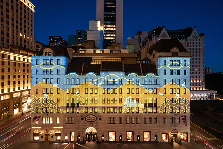 The facade of the women’s store extends the narrative with a light animation that moves from Mongolian cashmere fields to thistle blossoms, before tracing the path of a thread that transforms into the Maison’s Quarona factory and finally into Bergdorf Goodman’s own contours.