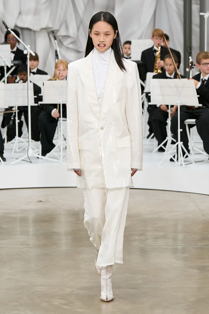 Maison Margiela’s Spring Summer 2026 show pushed forward ideas of construction, layering, and material play, drawing on its archive while introducing practical innovations. From tuxedo tailoring in denim to the return of heel-less footwear and plasticised silk jackets, the presentation framed everyday garments as opportunities for reinvention.