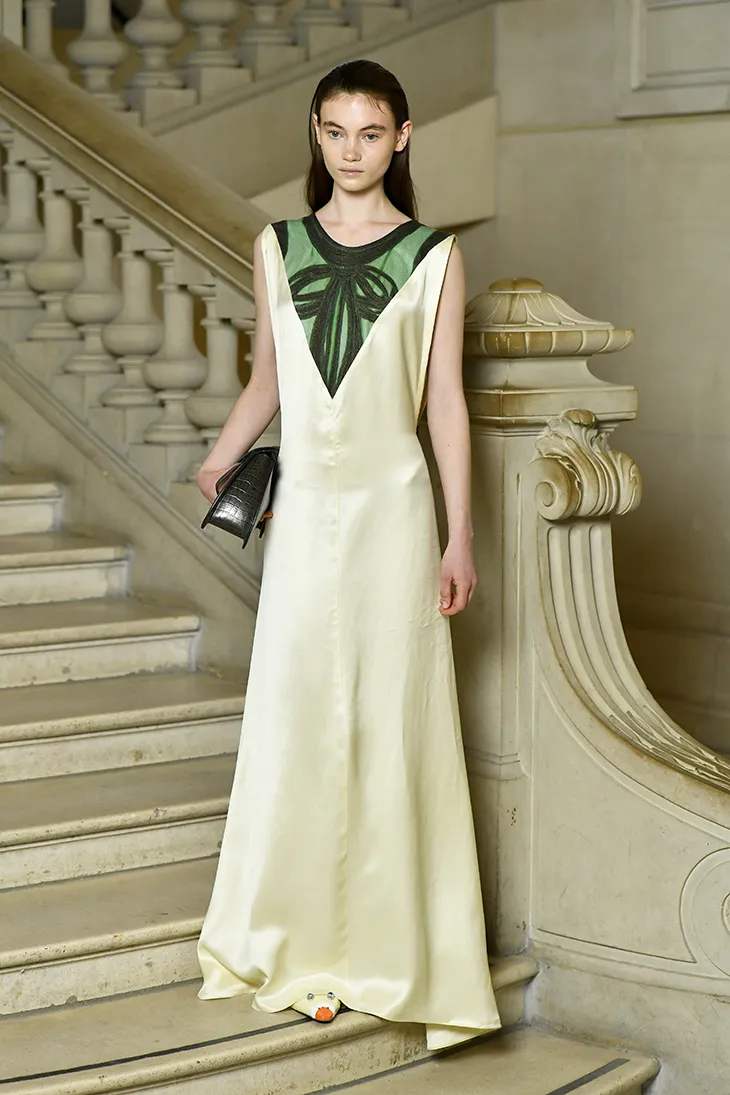 The partnership with KIKO MILANO, established in 2021, returned for this season. Makeup by Ruby Mazuel introduced translucent lips and gentle pastel details, which drew subtle focus to the eyes. Carole Douard designed hairstyles that extended the theme of lightness, using SHU UEMURA Art of Hair products to create silky textures that moved with sculptural precision.
