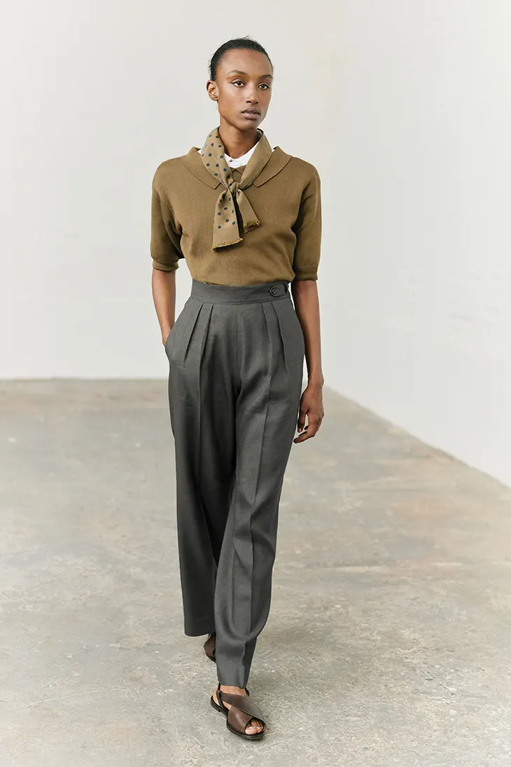 The collection builds around separates designed to work together, creating a natural style language that emphasizes personal choice. Relaxed cuts, lightweight fabrics, and versatile shapes define the season. Generously cut shirts in cotton poplin, linen, and silk set the tone, styled open over layers and paired with lightweight knits. Unstructured blazers in muted shades complement wide-leg trousers, balancing looseness with subtle structure.
