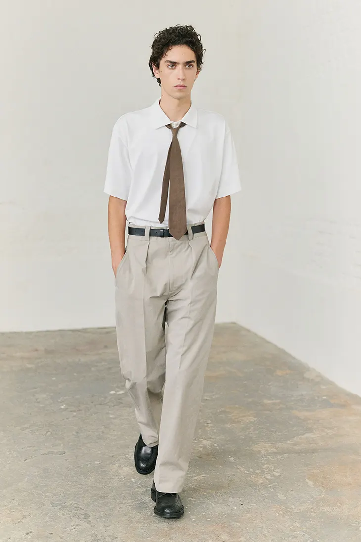 Proportion continues to play a central role. Longer hemlines and oversized silhouettes appear throughout, styled against sharper, tailored pieces. Tailoring itself feels softer and less rigid, with a focus on summer practicality. A Flap Pocket Blazer cut in fine stripe cotton silk is paired with deliberately long Pleated Shorts, forming an updated approach to summer suiting.